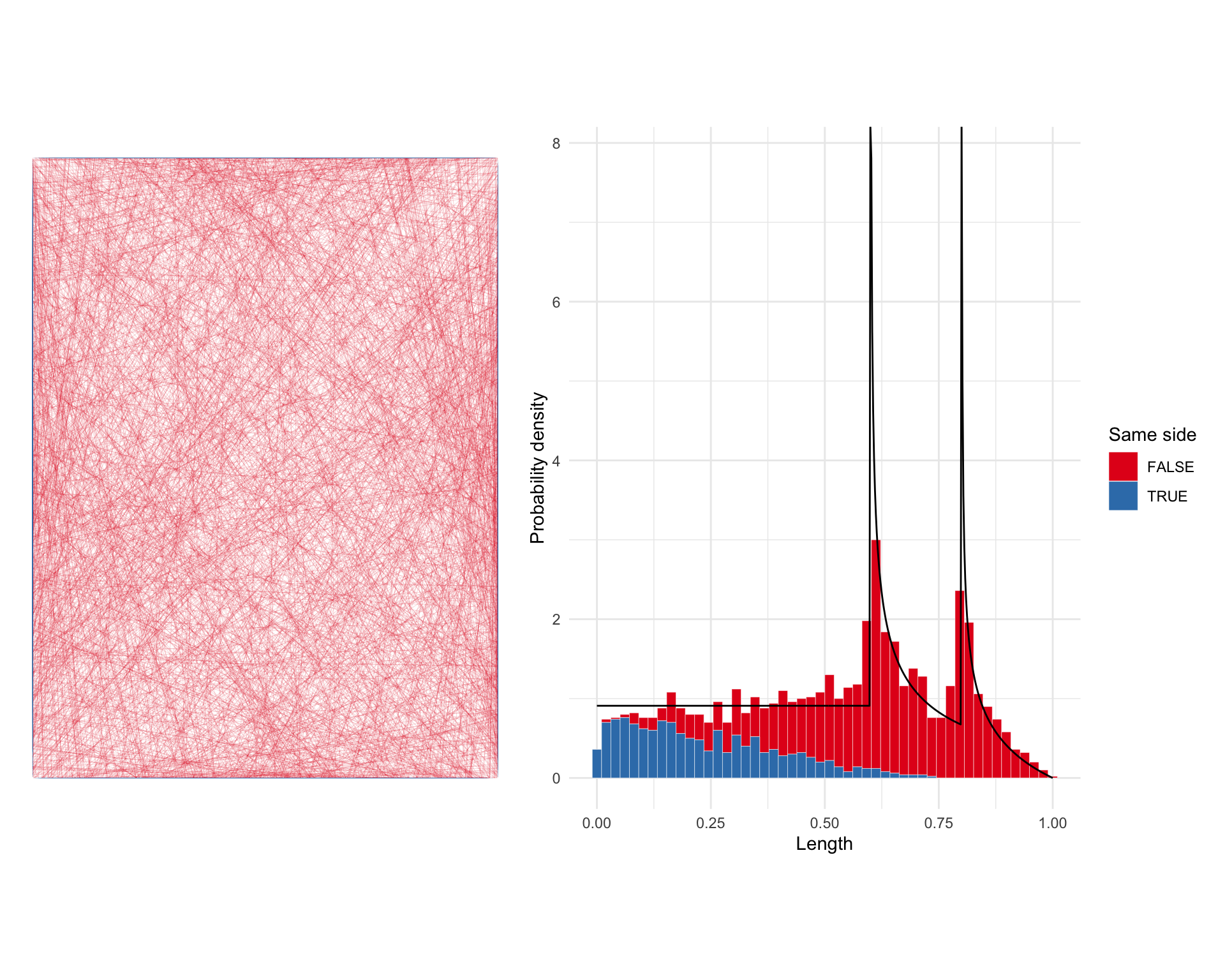 The setup here is to ask what is the expected distance between the entry and exit points of lines crossing a rectangle or some other shape—although we’ll stick to rectangles in this section. This seems rather artifical, although the key paper on the topic begs to differ: